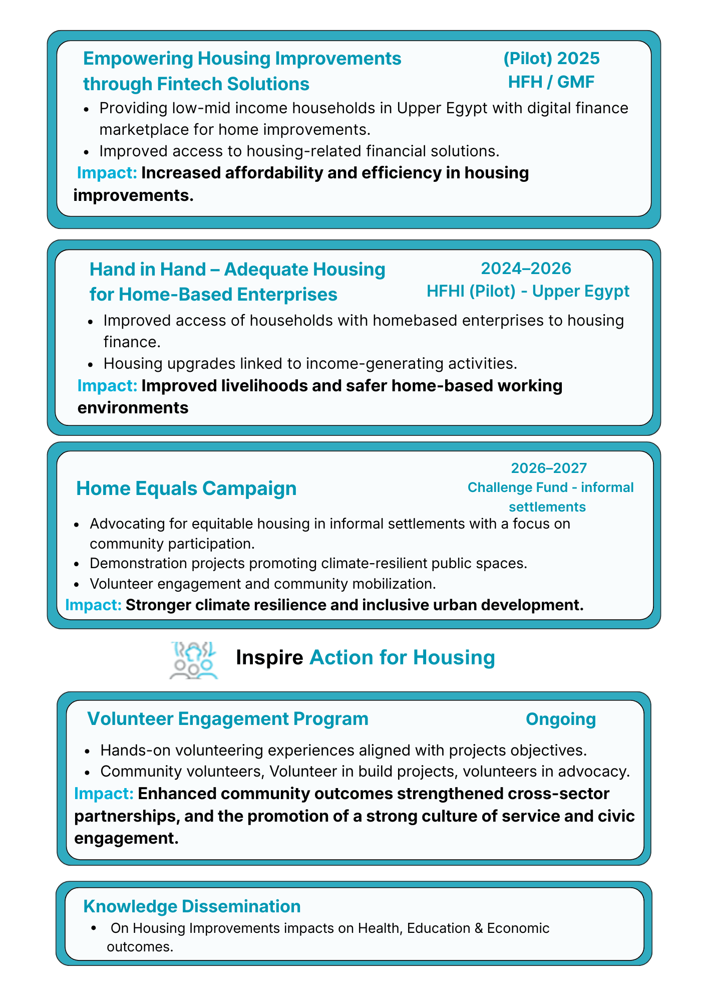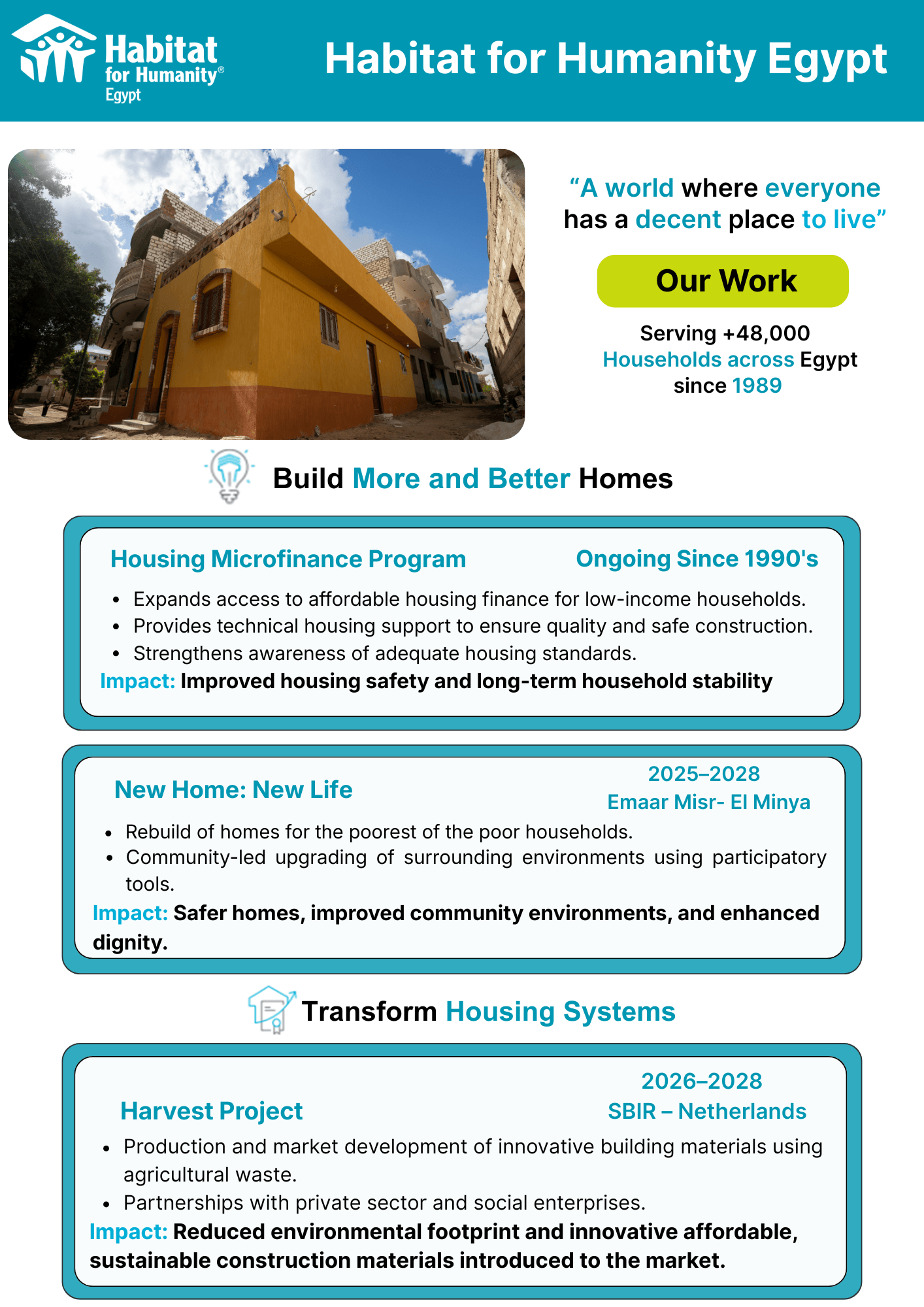 Habitat for Humanity Egypt (HFHE) has been serving over 48,000 households across Egypt since 1989 and currently operates in more than 40 communities across five governorates, in partnership with strategic local organizations and community members. Its programs include housing microfinance to support home improvements, construction of homes for the most vulnerable families, development of housing market systems including digital housing finance and fostering innovation and entrepreneurship within the housing sector.